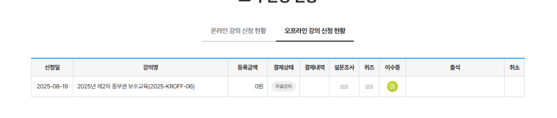 오프라인 강의 신청 현황에 들어가서, 이수증 출력하기 버튼을 누르면